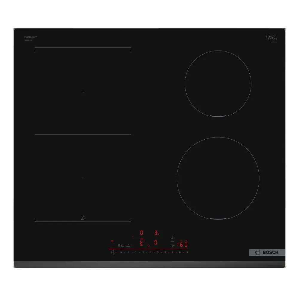 Современная и долговечная плитаКорпус варочной панели Bosch PVS631HC1E Serie 4 выполнен из стеклокерамики черного цвета. Материал отличается высокой устойчивостью к различным повреждениям: на поверхности не появляются сколы, царапины и потертости, она легко очищается от загрязнений. Плита обладает скошенными краями. ОснащениеПрибор оборудован четырьмя конфорками разной мощности. Две прямоугольные можно объединять в индукционный мост CombiZone. Удобный выбор настроек обеспечивает сенсорный блок Touch Select с дисплеем. В горелки интегрированы сенсоры распознавания посуды: при установке кастрюли и сковороды зона автоматически регулирует степень нагрева. Оптимальный результатМощность регулируется на 17 уровнях, что позволяет точно установить температуру для каждого блюда. В прибор заложены функции ReStart и QuickStart для быстрого запуска и возобновления программы после выключения. Предусмотрена опция Power Boost, которая повышает мощность нагрева, что ускоряет процесс приготовления. Безопасное использование прибораВарочная панель Bosch PVS631HC1E снабжена блокиратором, который не позволяет детям включить плиту или изменить настройки. Встроенный сенсор остаточного тепла покажет, когда к поверхности можно прикасаться без риска получить ожог.