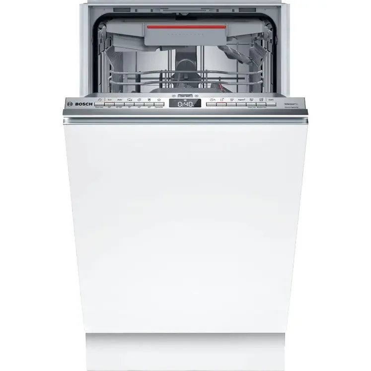 Узкая посудомоечная машинаBosch SPV6EMX65Q обладает шириной всего 44,8 см, встраивается в нишу размером 81,5-87,5х45х55 см. При скромных габаритах позволяет за один раз очистить до десяти комплектов посуды. Для ее размещения используются три корзины и полочка для чашек. Высоту верхнего короба можно менять. Широкий функционалВ устройство заложены шесть программ, температура воды регулируется на четырех уровнях. Предусмотрены быстрый, экономичный и интенсивный режимы, функция экстра-сушки для посуды с пористой структурой. Опция HygienePlus поможет эффективно избавиться от бактерий и микробов. Электронное управлениеМашина Bosch SPV6EMX65Q оборудована закрытой кнопочной панелью. Информация о настройках, наличии моющих средств, времени до окончания цикла отображается на дисплее. Когда процесс завершится, раздастся звуковой сигнал. Таймер отложенного старта программируется сроком до 24 часов, что позволит запустить устройство в удобное время. Безопасное использованиеЗалив помещения предотвратит система AquaStop — при обнаружении протечки подача воды останавливается. При синхронизации со смартфоном и интеграции в экосистему «Умный дом» управлять работой машины можно удаленно.