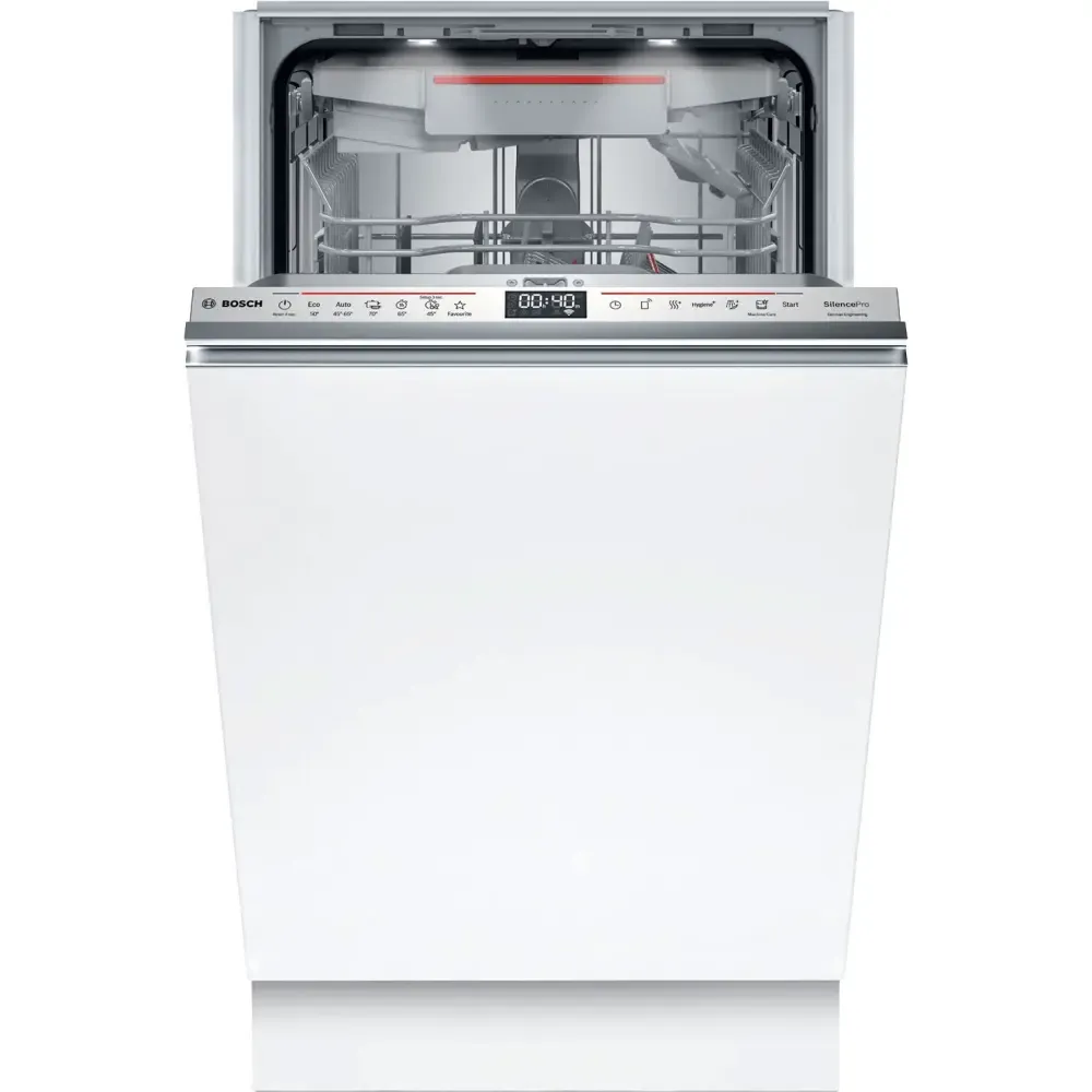 Узкая встраиваемая посудомоечная машинаМодель Bosch SPV6EMX76Q — оптимальный вариант для малогабаритной кухни. Ширина прибора — всего 44,8 см, поэтому он займет небольшое пространство в помещении. Для размещения посуды используются три корзины, высоту верхнего короба можно менять. Без потери эффективностиМашина рассчитана на единовременную загрузку до десяти комплектов посуды. В память устройства заложены шесть стандартных программ, четыре температурных режима. Среди них — «Автоматическая», «Быстрая», «Дополнительное полоскание». Предусмотрена функция HygienePlus — в конце цикла посуда дополнительно ополаскивается горячей водой. Управление без лишних хлопотДля выбора настроек машина оборудована закрытой сенсорной панелью. Информация об установленном режиме отображается на дисплее, время до завершения процесса дублируется лучом на полу. Индикаторы покажут наличие ополаскивателя и соли. В модель интегрирован таймер отложенного запуска, позволяющий начать мойку в удобное время сроком до 24 часов. Bosch SPV6EMX76Q можно синхронизировать со смартфоном, чтобы управлять настройками в приложении. БезопасностьВ машине реализована эффективная полная защита от протечек Aquastop. При возникновении аварийной ситуации подача воды автоматически блокируется, что предотвращает залив помещения. ЭкономичностьПосудомоечной машине Bosch SPV6EMX76Q присвоен высокий класс энергоэффективности А+++. За цикл она расходуется всего 9,5 л воды и минимальное количество электричества. За счет инверторного мотора во время работы устройства уровень шума составляет всего 45 дБ — соответствует звуку обычного разговора.