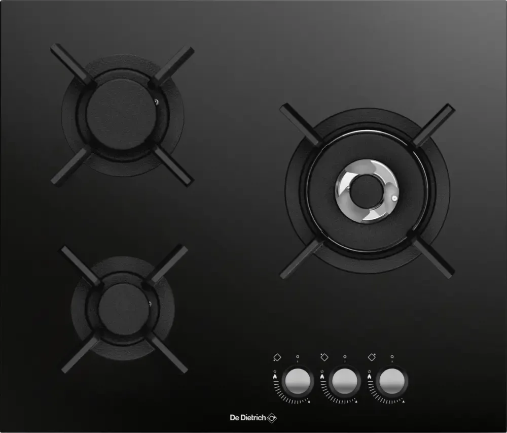 - 3 газовые конфорки: Левая задняя — стандартная 1750 Вт; Левая передняя — маленькая 1000 Вт; Правая — большая мощная 3500 Вт; - Общая мощность: 6250 Вт
