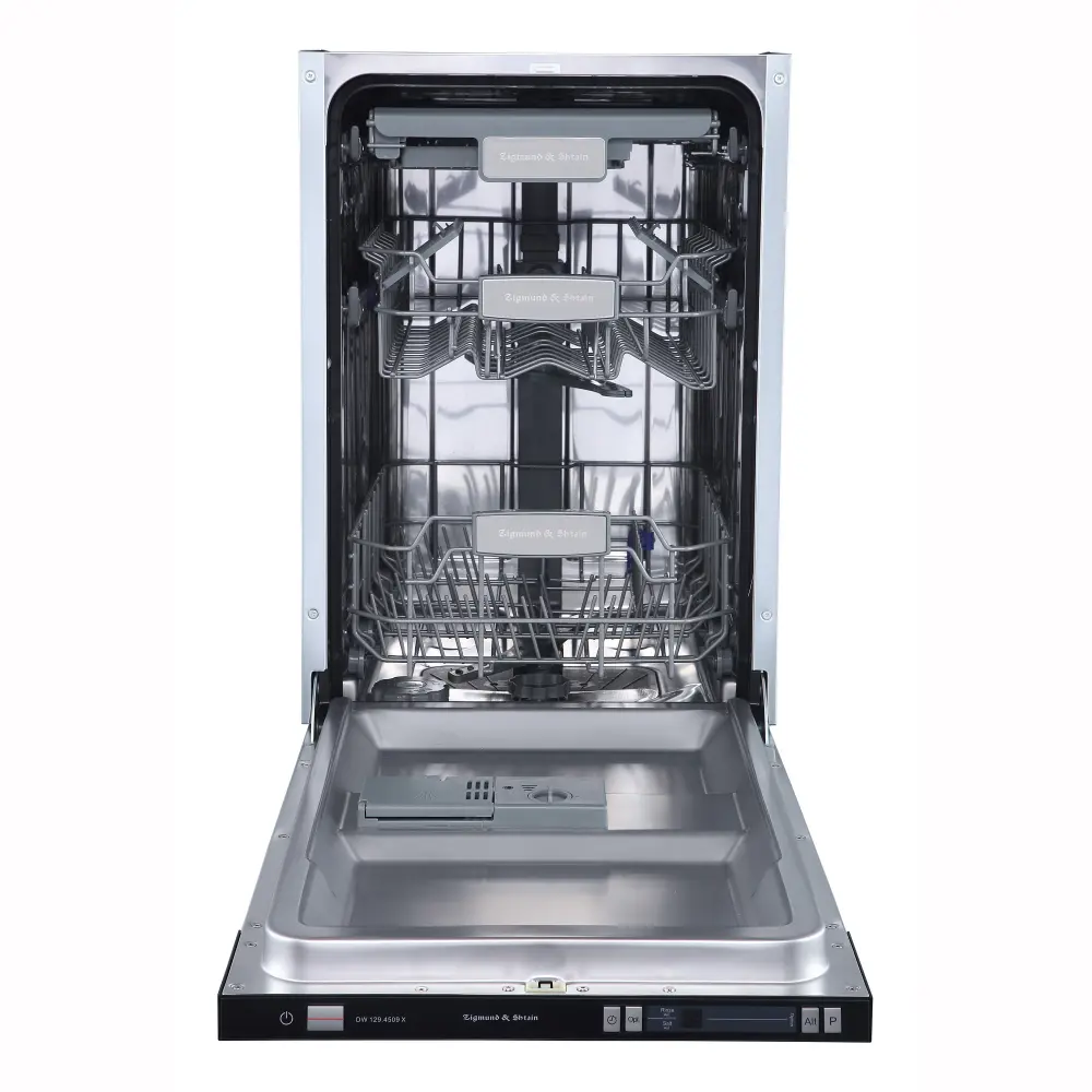 Посудомоечная машина Zigmund & Shtain DW 129.4509 X сочетает в себе компактность, многофункциональность, экономию и качество. ПММ легко отмоет 10 комплектов посуды, тщательно ополаскивает поверхность столовых приборов, не оставляя следов моющих средств. Несмотря на многофункциональность, имеет простую панель управления с интуитивно понятным интерфейсов. Встраиваемая техника гармонично вписывается в современный интерьер кухни и экономит не только воду и ваше время, но и место даже на небольшой по площади кухни. Достоинства посудомойки: Функция мытья и сушки посуды относятся к классу А – самый высокий класс работы посудомойки, максимально сохраняет посуду в целости и обеспечивает качественный результат. 9 встроенных программ под любые потребности пользователя исходя из времени, типа посуды и экономии электроэнергии: • 3 в 1 (50-65°С, 215 мин) • Авто (45-65°С, 150 мин) • Интенсивная (50-70°С, 175 мин) • Обычная (45-65°С, 185 мин) • Экономичная (45-55°С, 220 мин) • Стекло (40-60°С, 130 мин) • 90 минут (65°С).