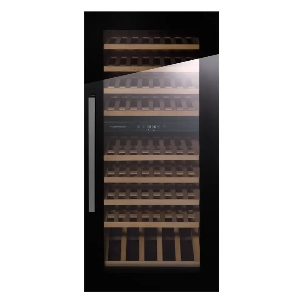 Оснащение: - Электронная система регулировки температуры с нажимными кнопками - Электронная индикация температуры - 8 съемных выдвижных полок из дерева - 1 деревянная полка для демонстрации под углом 45° - Дверь с черным стеклом и защитой от ультрафиолетовых лучей - Вместимость: 79 бутылок - 2 разделенные температурные зоны, регулирование в диапазоне 5-18°C - Светодиодная подсветка (по 2 светодиода мощностью 0,2 кВт на каждую зону) - Система охлаждения посредством динамической циркуляции воздуха - Звуковая сигнализация - Изменяемая навеска двери - Резервуар для воды для дополнительного увлажнения - Макс. угол открытия двери: 90° - Без ручки (см. Аксессуары)