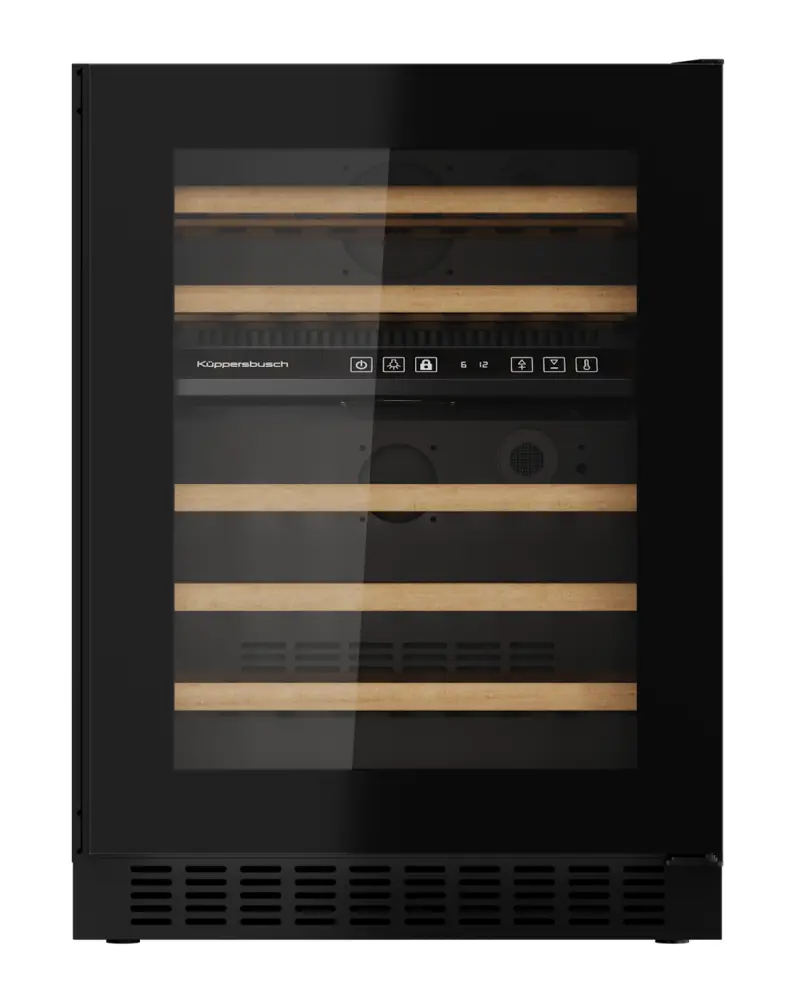 "Оснащение: - Электронная система регулировки температуры с нажимными кнопками - Вертикальный дисплей для электронной индикации температуры - Вместимость: 46 бутылок (бутылки Бордо 0,75 л) - 5 выдвижных полок из дерева, на телескопических направляющих - Дверь с черным стеклом и защитой от ультрафиолетовых лучей - 2 температурные зоны: 5 - 20°C - Светодиодная подсветка (2 лампы по 0,2 Вт в каждой температурной зоне) - Звуковая сигнализация - Изменяемая навеска двери - Резервуар для воды для дополнительного увлажнения - Возможность установки под столешницу, съемная вентиляционная решетка с передней стороны Технические данные - Энергопотребление в год99 кВт/ч - Размеры прибора Ш х В х Г 595 х 815-885 х 570 мм - Размеры ниши Ш х В х Г 600 х мин. 820 х 575 мм - Уровень шума38 дБ"