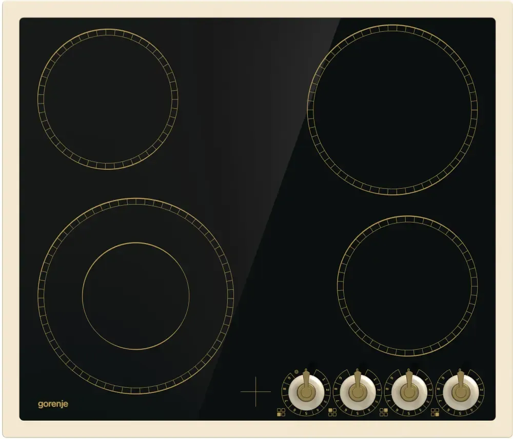 GORENJE EC 642 CLI - это независимая электрическая варочная поверхность, которую можно комбинировать с разными моделями духовых шкафов. Идеально гладкая поверхность выполнена из прочной стеклокерамики, которая устойчива к механическим повреждениям и царапинам. Черная стеклянная поверхность в сочетании с роскошными ручками в ретро-стиле гармонично подойдут для кухонных гарнитуров в классическом стиле. ОСНОВНЫЕ ХАРАКТЕРИСТИКИ - индикатор остаточного тепла, который позволяет поддерживать приготовленные блюда теплыми и предостерегает от получения ожогов. - Hi-Light конфорки с нагревательным элементом в виде лента, уложенной змейкой из высокоомного сплава - механические поворотные переключатели.