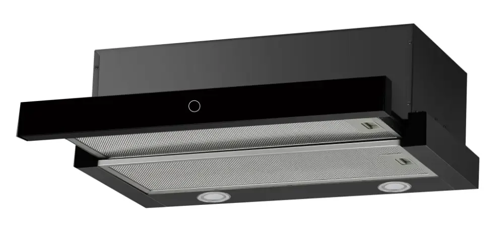 Встраиваемая вытяжка с двумя мощными моторами и современным сенсорным управлением на выдвижной панели.