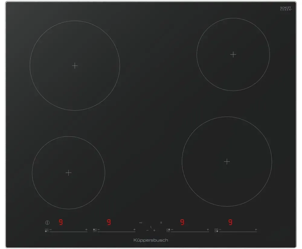 Управление “glideControl+”. 10 уровней мощности. 4 варочные зоны. Оснащение: - 10-ступенчатая регулировка мощности “glideControl+” с красными индикаторами - Индикация остаточного тепла - Таймер с функцией отключения - Централизованное отключение - Принудительное отключение (ограничение продолжительности работы) - 2 варочные зоны 185 мм / 1700 Вт (2100 Вт*) - 2 варочные зоны 150 мм / 1200 Вт (1500 Вт*) * при включении режима «Power» Технические данные: - Потребляемая мощность 7,2 кВт - Размеры прибора Ш х Г 605 х 515 мм - Глубина встраивания 58 мм - Размеры ниши Ш х Г 560 х 490 мм