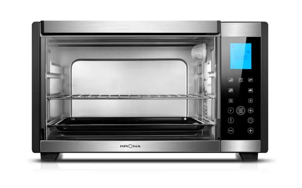 Электрическая отдельностоящая мини-печь. Объем 28 литров. Корпус из нержавеющей стали. Антипригарное покрытие камеры. Мощность 1600 Вт. Цифровое сенсорное управление. Плавная регулировка температуры до 230 С. 4 нагревательных элемента из нержавеющей стали. Таймер от 0 до 180 минут со звуковым сигналом окончания работы. 6 режимов работы: верхний нагрев, нижний нагрев, двойной нагрев, верхний нагрев с конвекцией, нижний нагрев с конвекцией, двойной нагрев с конвекцией. 7 автоматических программ: пицца, хлеб, печенье, торты, мясо, поддержание тепла, разморозка. Внутренняя подсветка. Стеклянная дверца. В комплекте: хромированная решетка, эмалированный противень, хромированная ручка. Прорезиненные ножки. Черный цвет. Ненагревающася стальная ручка дверцы. Гарантия 2 года + 1 дополнительный год при регистрации продукта на сайте <a class="txttohtmllink" href="https://krona.ru/addguarantee/">https://krona.ru/addguarantee/</a>. Сделано в КНР.<br />