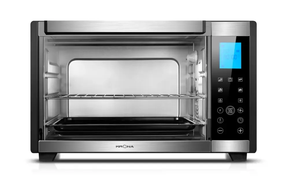 Электрическая отдельностоящая мини-печь. Объем 35 литров. Корпус из нержавеющей стали. Антипригарное покрытие камеры. Мощность 1600 Вт. Цифровое сенсорное управление. Плавная регулировка температуры до 230 С. 4 нагревательных элемента из нержавеющей стали. Таймер от 0 до 180 минут со звуковым сигналом окончания работы. 6 режимов работы: верхний нагрев, нижний нагрев, двойной нагрев, верхний нагрев с конвекцией, нижний нагрев с конвекцией, двойной нагрев с конвекцией. 7 автоматических программ: пицца, хлеб, печенье, торты, мясо, поддержание тепла, разморозка. Внутренняя подсветка. Стеклянная дверца. В комплекте: хромированная решетка, эмалированный противень, хромированная ручка. Прорезиненные ножки. Черный цвет. Ненагревающася стальная ручка дверцы. Гарантия 2 года + 1 дополнительный год при регистрации продукта на сайте <a class="txttohtmllink" href="https://krona.ru/addguarantee/">https://krona.ru/addguarantee/</a>. Сделано в КНР.<br />