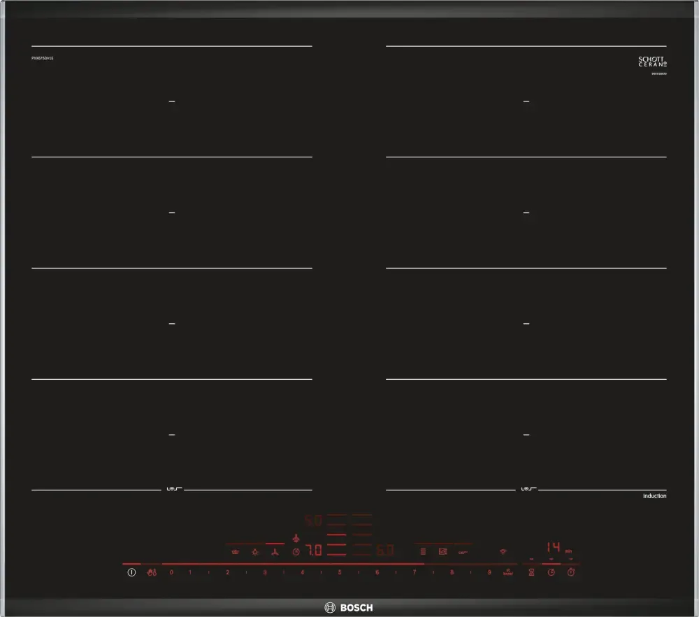 Индукционная варочная панель Bosch PXX675DV1E Serie 8 - это высокотехнологичное устройство для приготовления пищи с четырьмя конфорками. Особенностью данной модели являются две зоны расширения FlexInduction, которые позволяют использовать посуду любого размера и формы. Панель выполнена в черном цвете, а ее поверхность изготовлена из стеклокерамики. Управление осуществляется с помощью сенсоров и системы TouchSelect, что обеспечивает простоту и удобство использования. Функция удаленного управления и мониторинга с помощью Home Connect позволяет управлять панелью через мобильное приложение, что очень удобно, если вам нужно заранее подготовить еду к определенному времени. Модель обладает 17 ступенями мощности, что позволяет точно регулировать температуру приготовления. Также присутствуют функции ReStart, QuickStart, PowerBoost, PowerManagement, MoveMode, которые делают процесс приготовления пищи быстрым и удобным. Сенсор PerfectFry на 5 температурных диапазонов поможет идеально поджарить мясо или рыбу, благодаря точной регулировке температуры. Безопасность использования панели обеспечивается главным выключателем, защитным отключением при перегреве, блокировкой от детей и индикацией остаточного тепла.