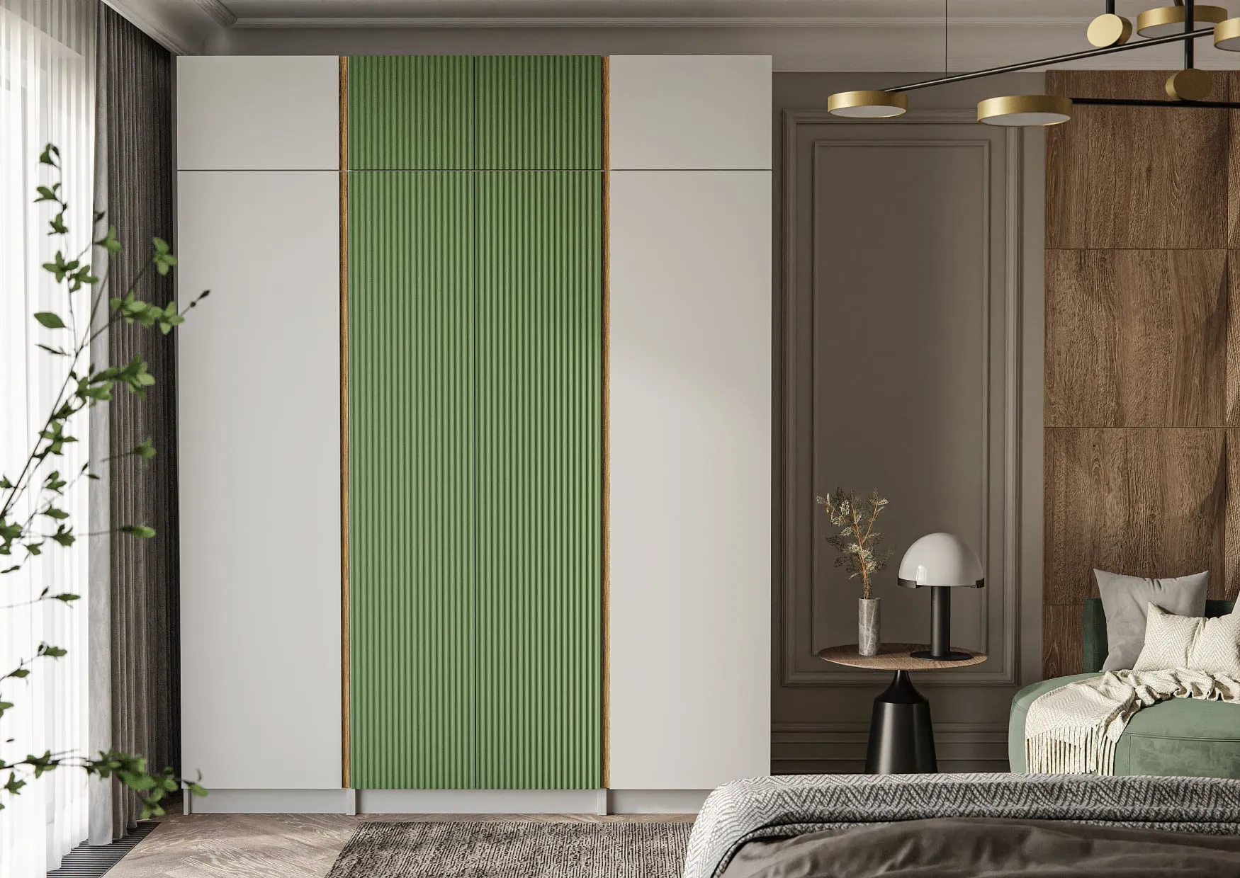 Фасады: МДФ Т641 фрезерованный, цвет RAL6011 мат / Т640, ручка дуб цвет 187, цвет RAL7047 мат