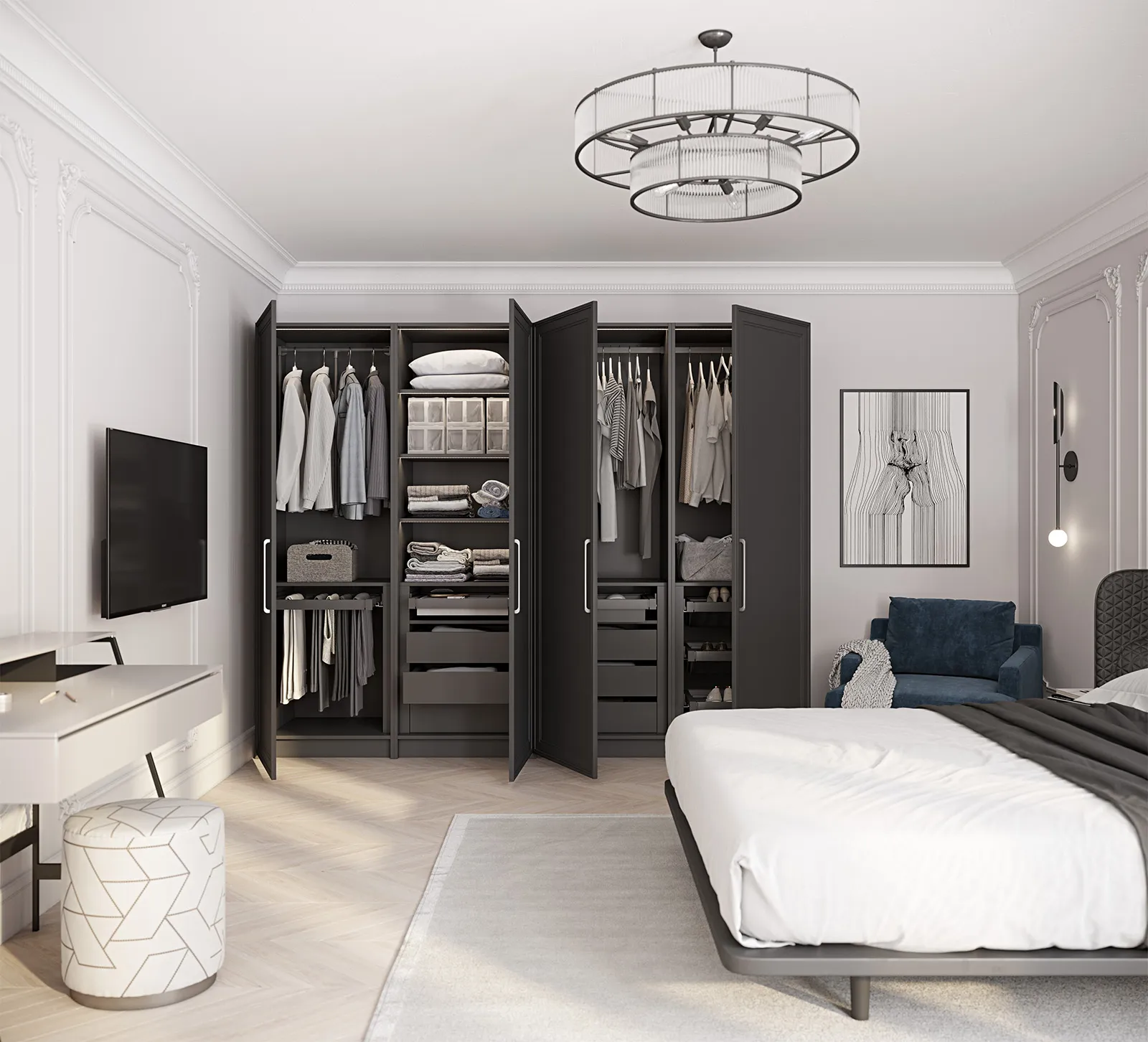 КАРКАС, ЗАДНЯЯ СТЕНКА, ПОЛКИ, ВЫДВИЖНЫЕ ЯЩИКИ ЛДСП Графит ФАСАДЫ Локарно (МДФ / ПВХ), цвет NCS S 8000-N матовый