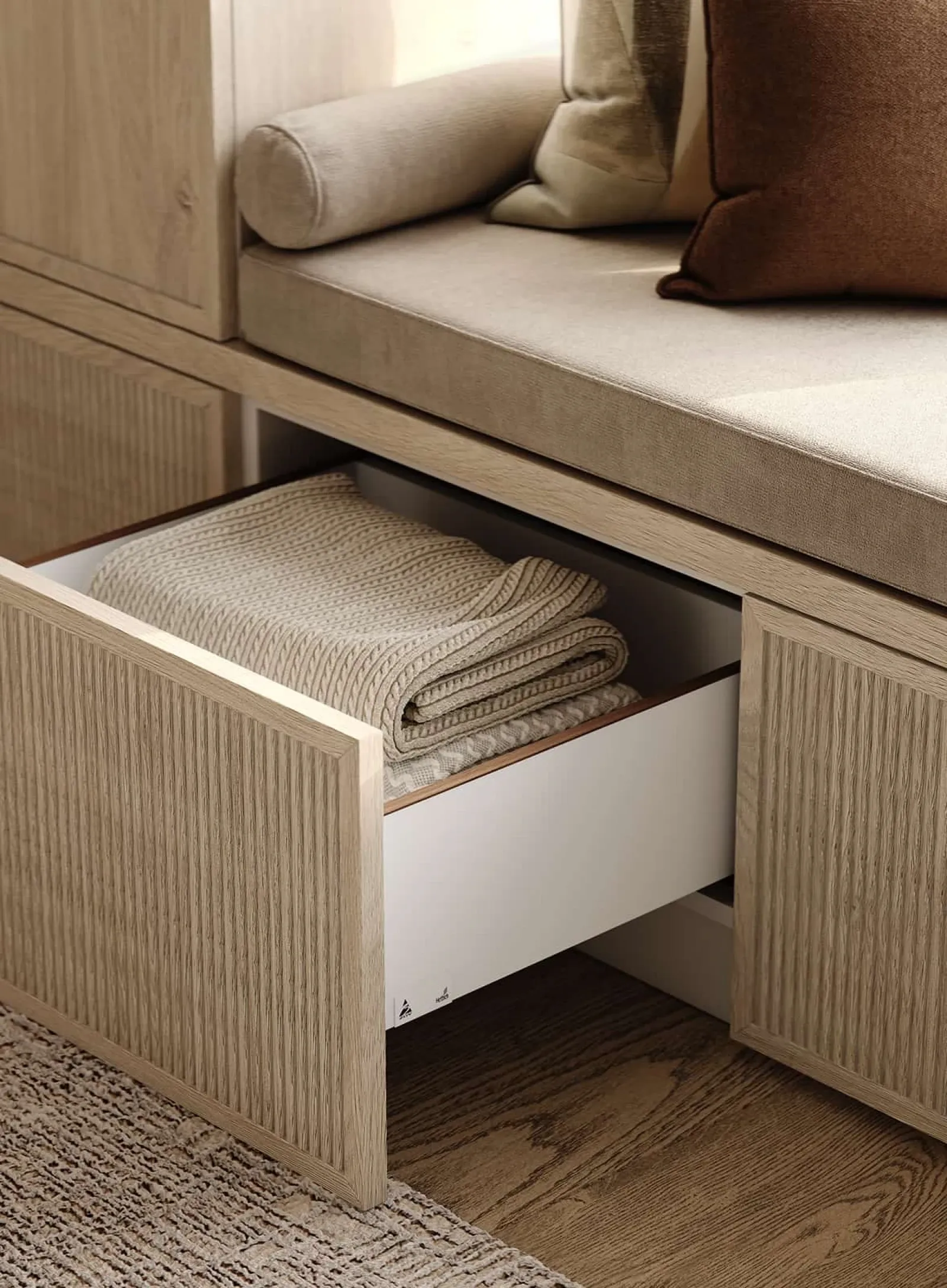 КАРКАС, ПОЛКИ, ВНУТРЕННИЕ ВЫДВИЖНЫЕ ЯЩИКИ, ЗАДНЯЯ СТЕНКА ЛДСП, цвет Белый Премиум / Белый ФАСАДЫ Т441, Т431В Массив дуба / шпон дуба, цвет #189 (воскобейц Белый)