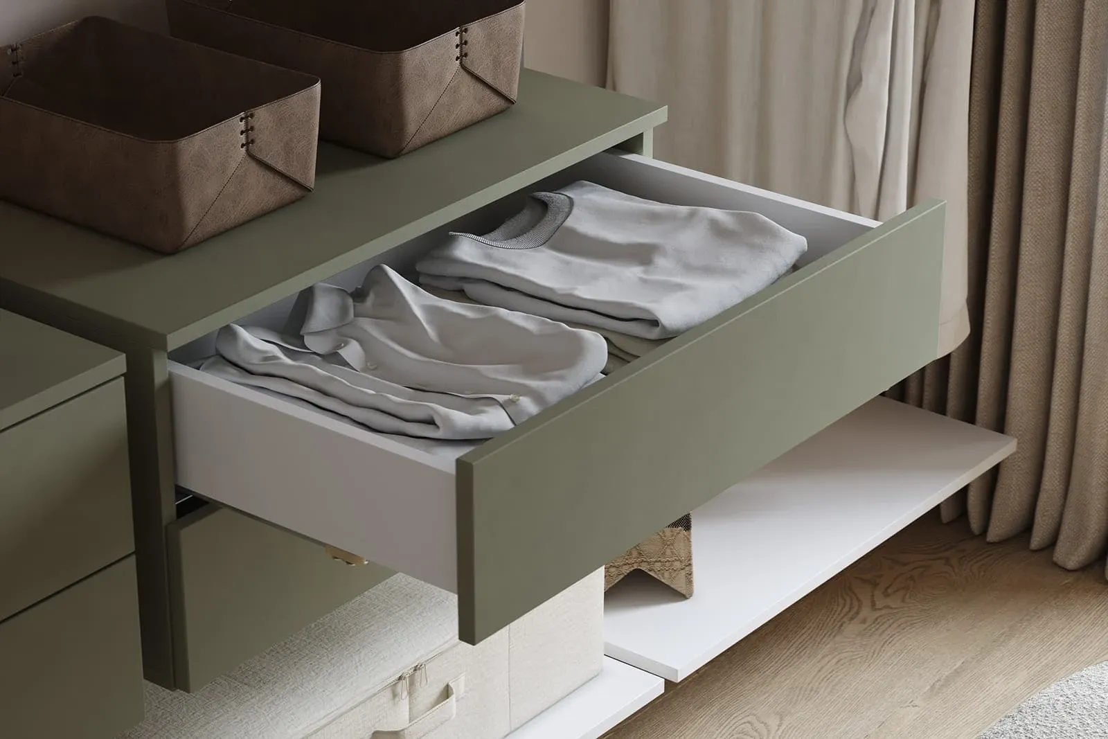 ОПОРНЫЙ ПРОФИЛЬ PA 02, цвет Черный Матовый НАВЕСНЫЕ ЭЛЕМЕНТЫ ЛДСП (толщина 18 мм), цвет Белый Премиум / крашеная МДФ (толщина 19 мм), цвет NCS S 4020-G30Y Матовый / стекло Графит прозрачное (толщина 6 мм)
