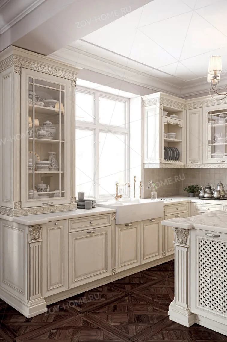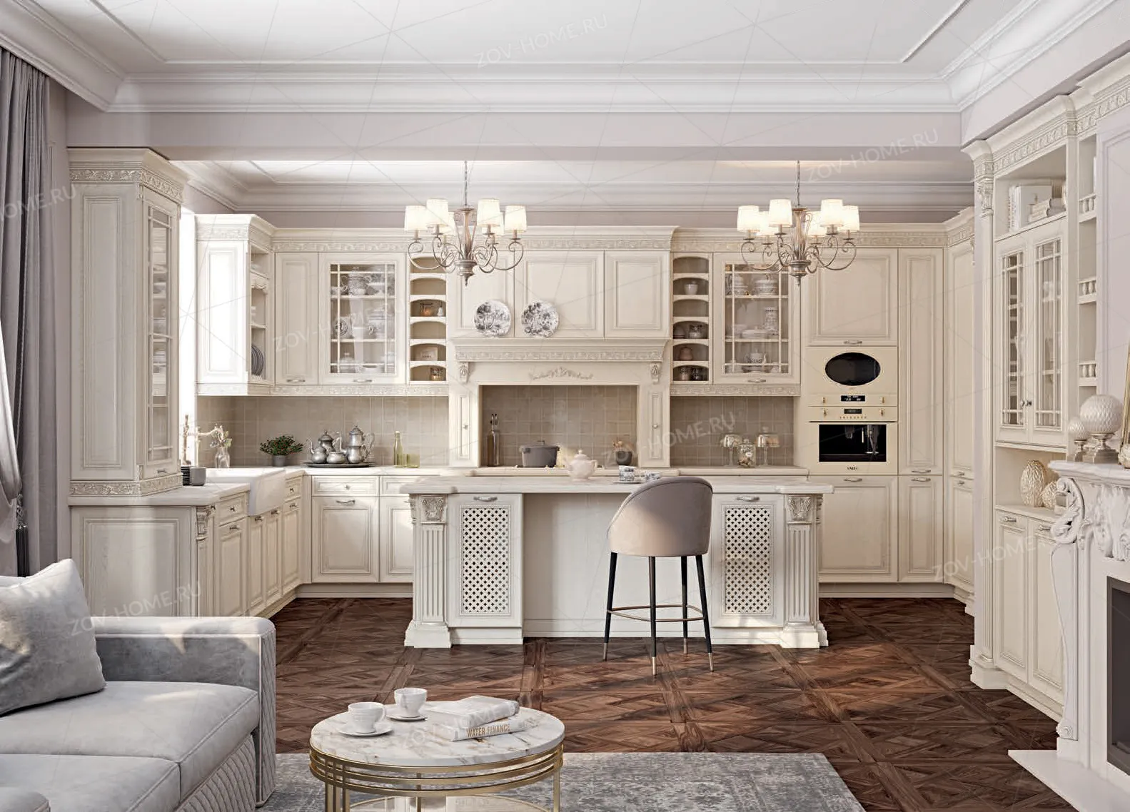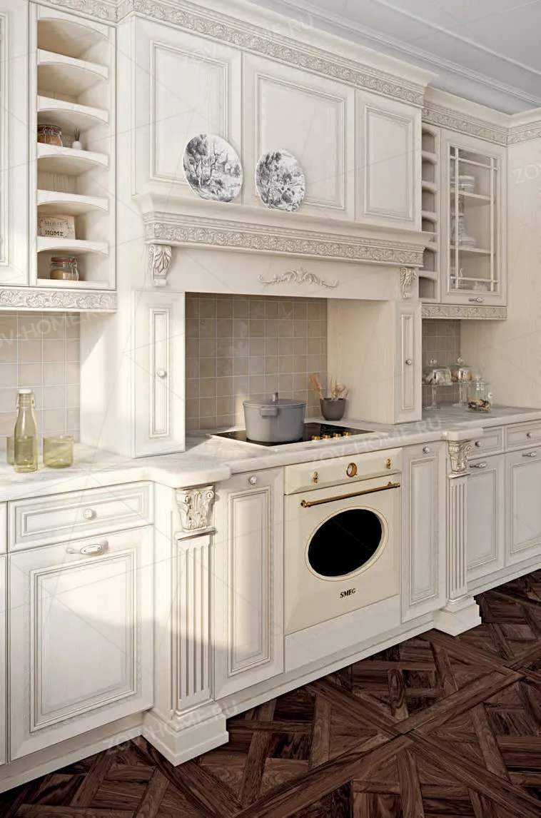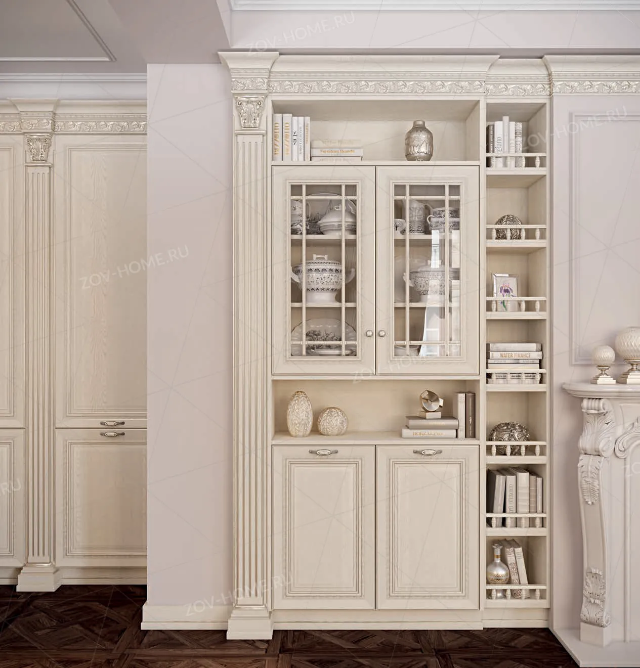 Декоративные элементы: Пилястра #5; опора нижняя декоративная ОНД-2-1, ОНД-2-2 лев / прав, ОНД-2-3; багет Б-3K Комби прямой (вставка с тиснением 15К); лепнина-5; капитель #5; балюстрада прямая (балясины «Бочонок»); плинтус мебельный ПМ-3 прямой; шкаф навесной для посуды МШНС 60; панель декоративная БПД-7-2; НМ «Полочница» (910 × 296); угловая развязочная планка НМУ
