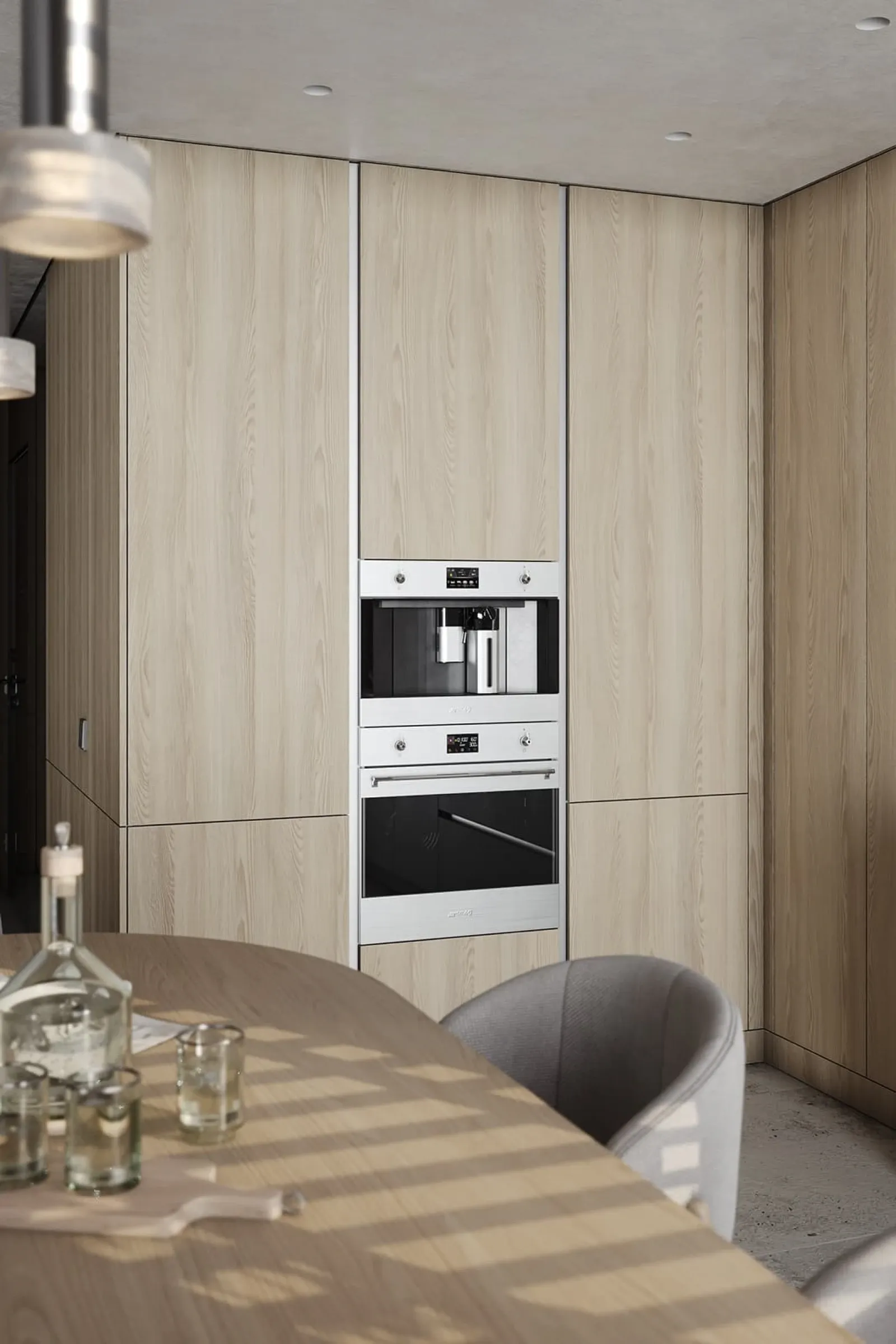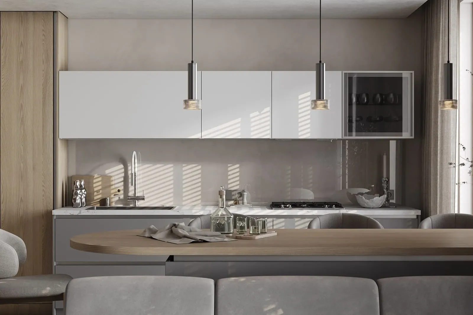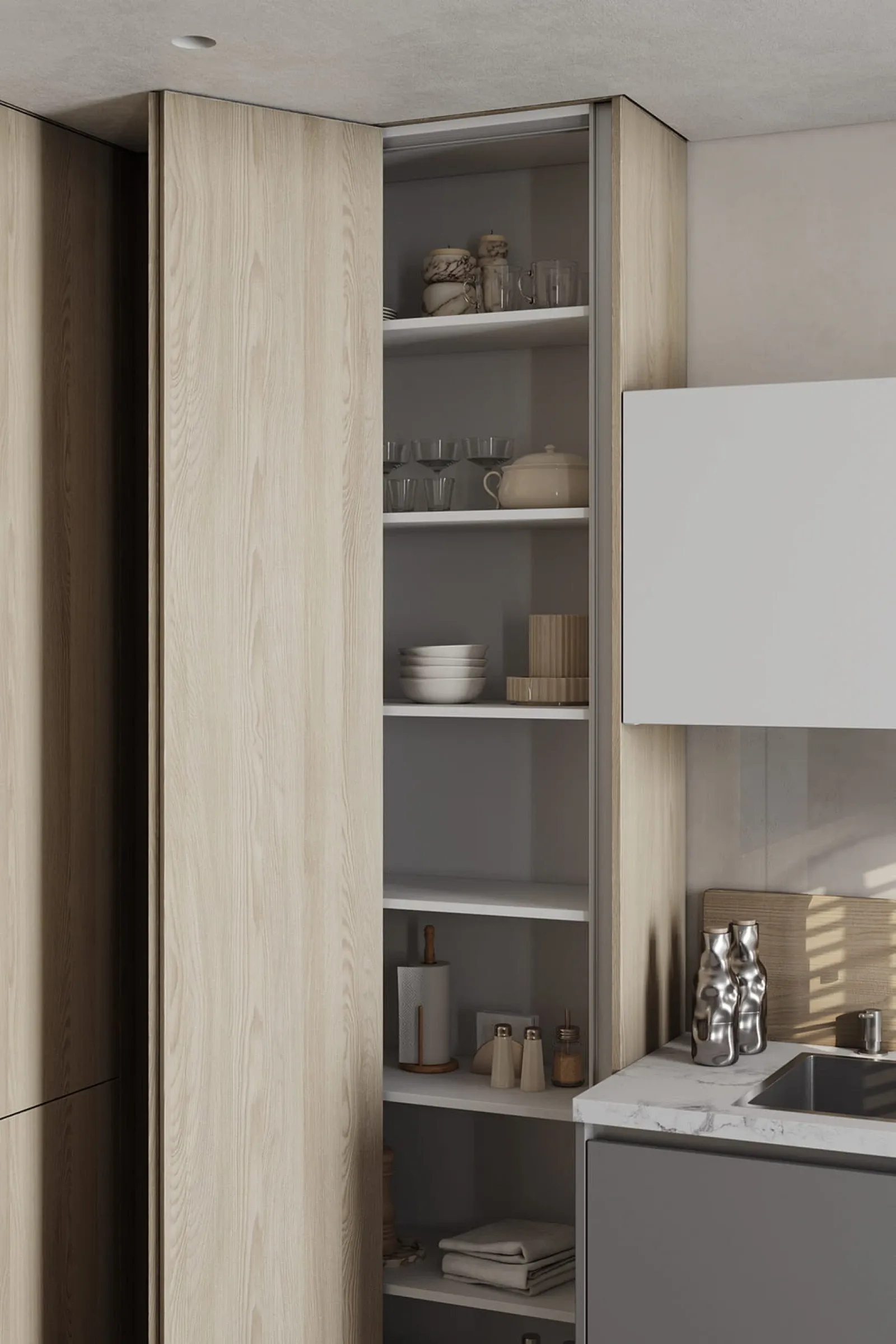 Фасады: ЛМДФ Тимбер, декор Ясень Наварра / пластик HPL Möbius Soft Touch, цвет Бьянко Фредо / Бартоло