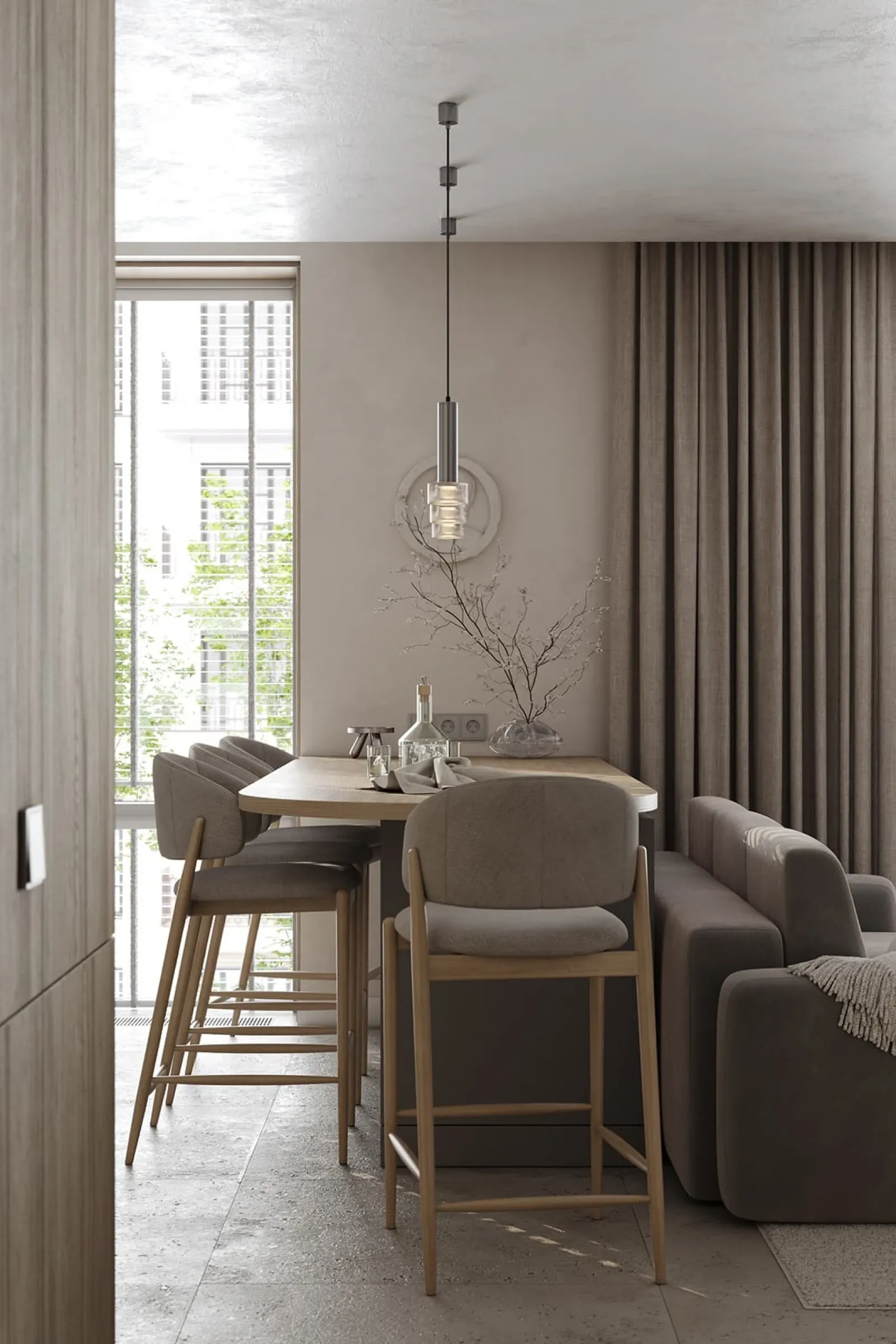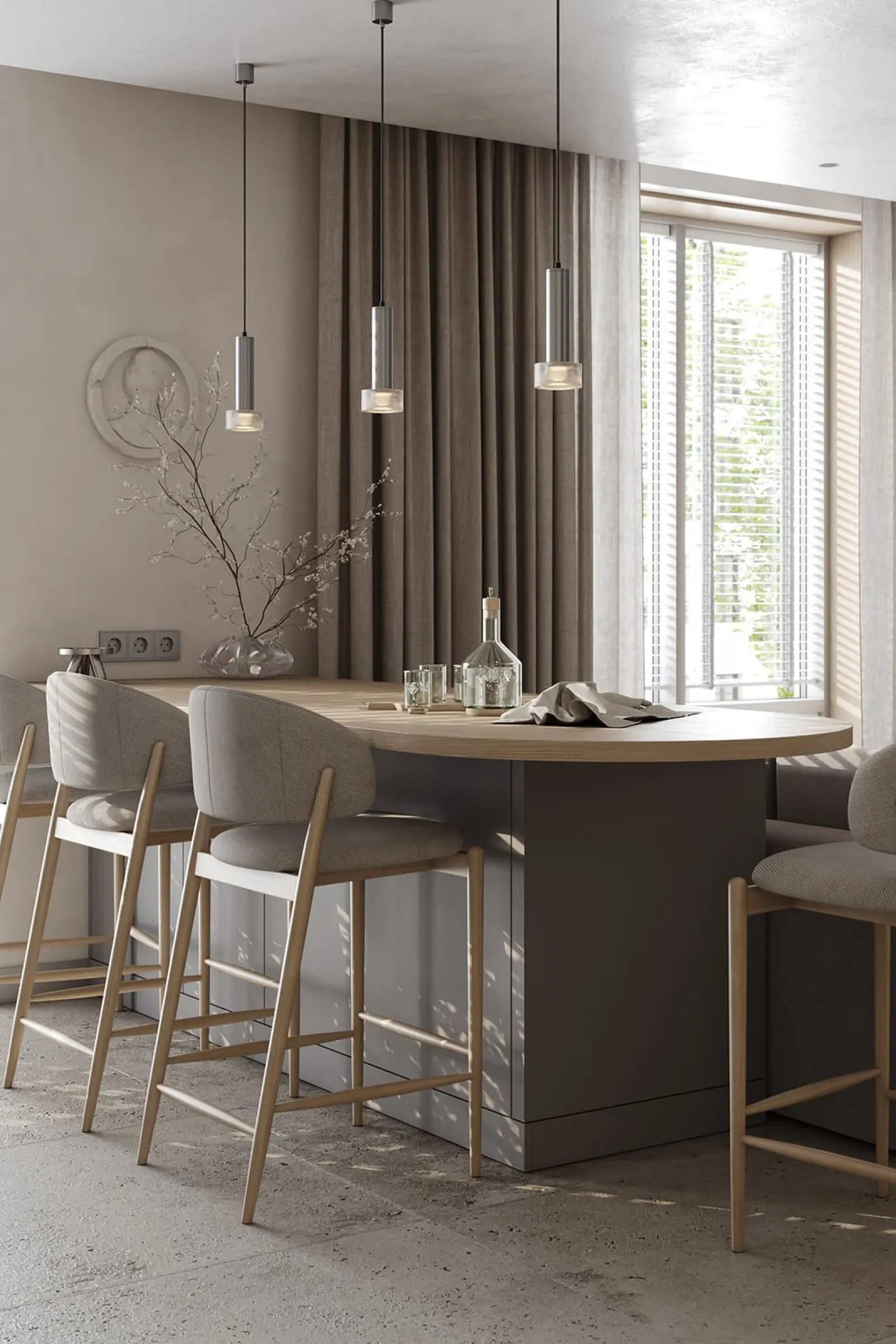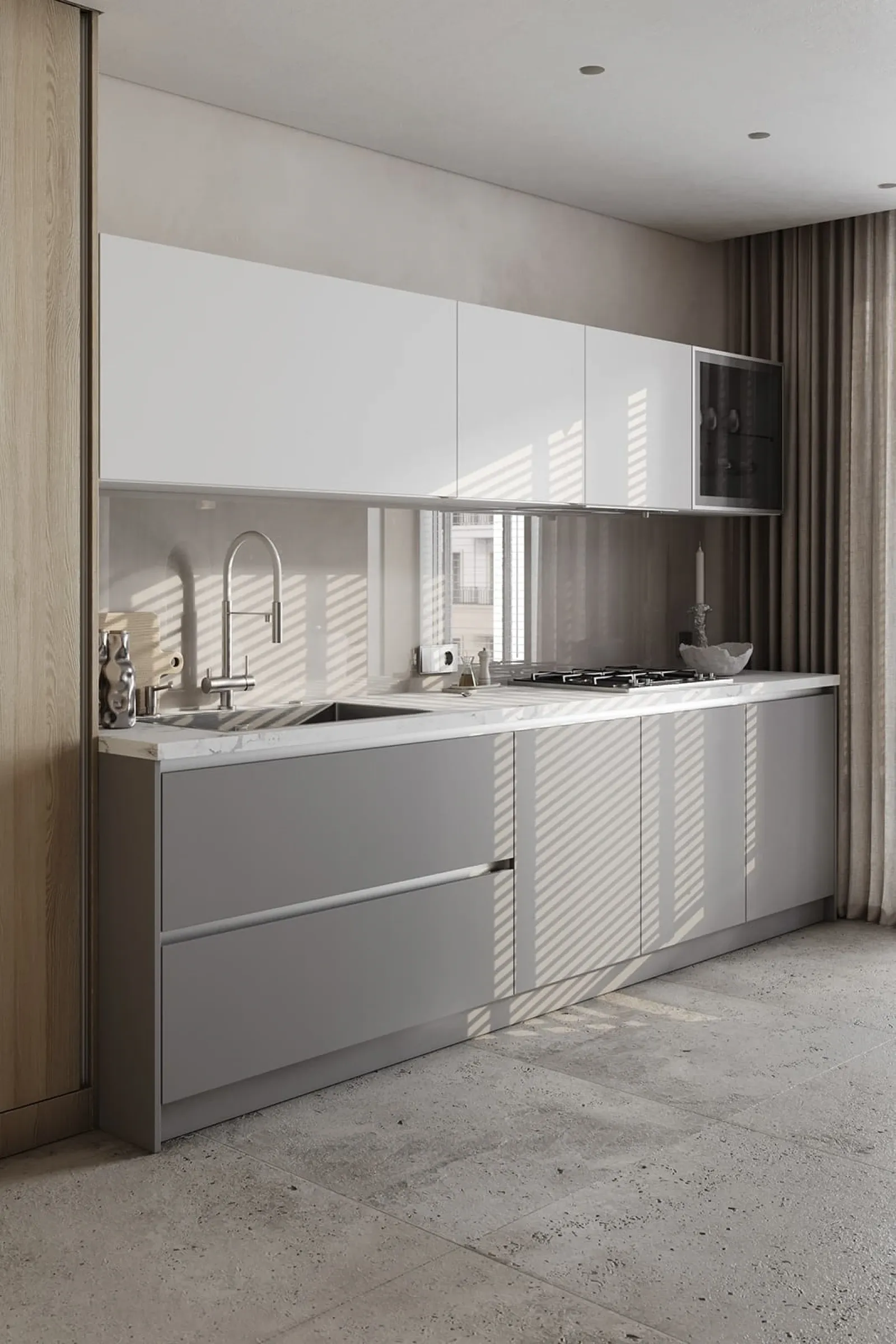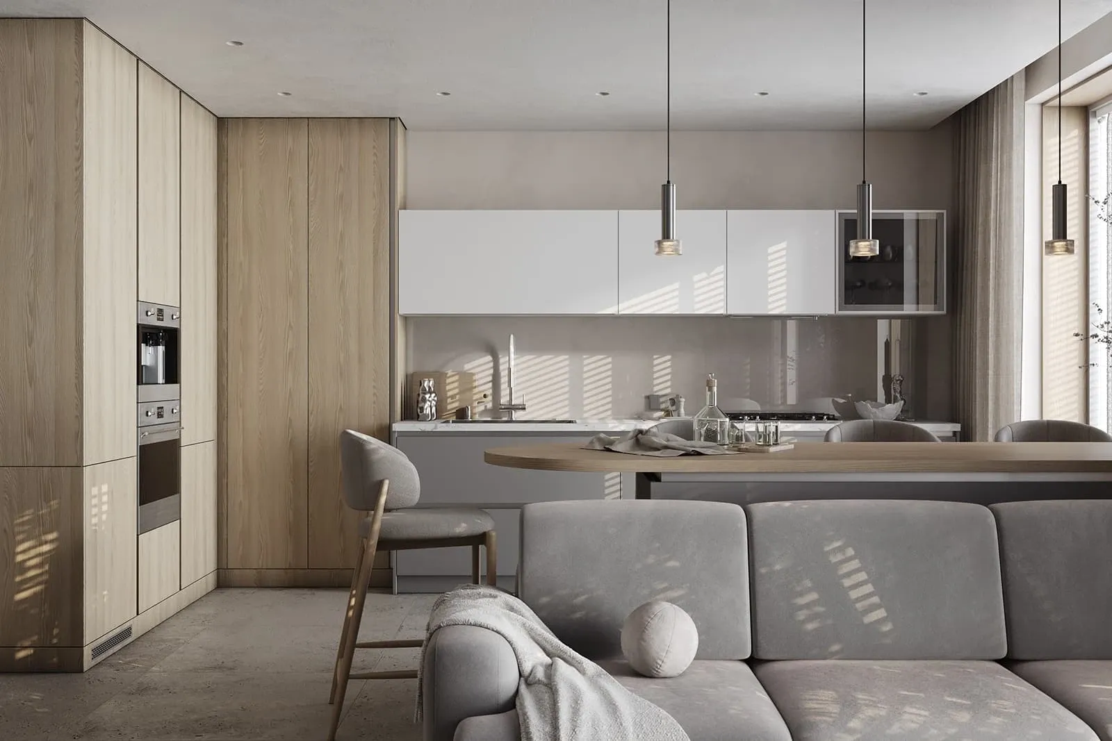 Фасады: ЛМДФ Тимбер, декор Ясень Наварра / пластик HPL Möbius Soft Touch, цвет Бьянко Фредо / Бартоло
