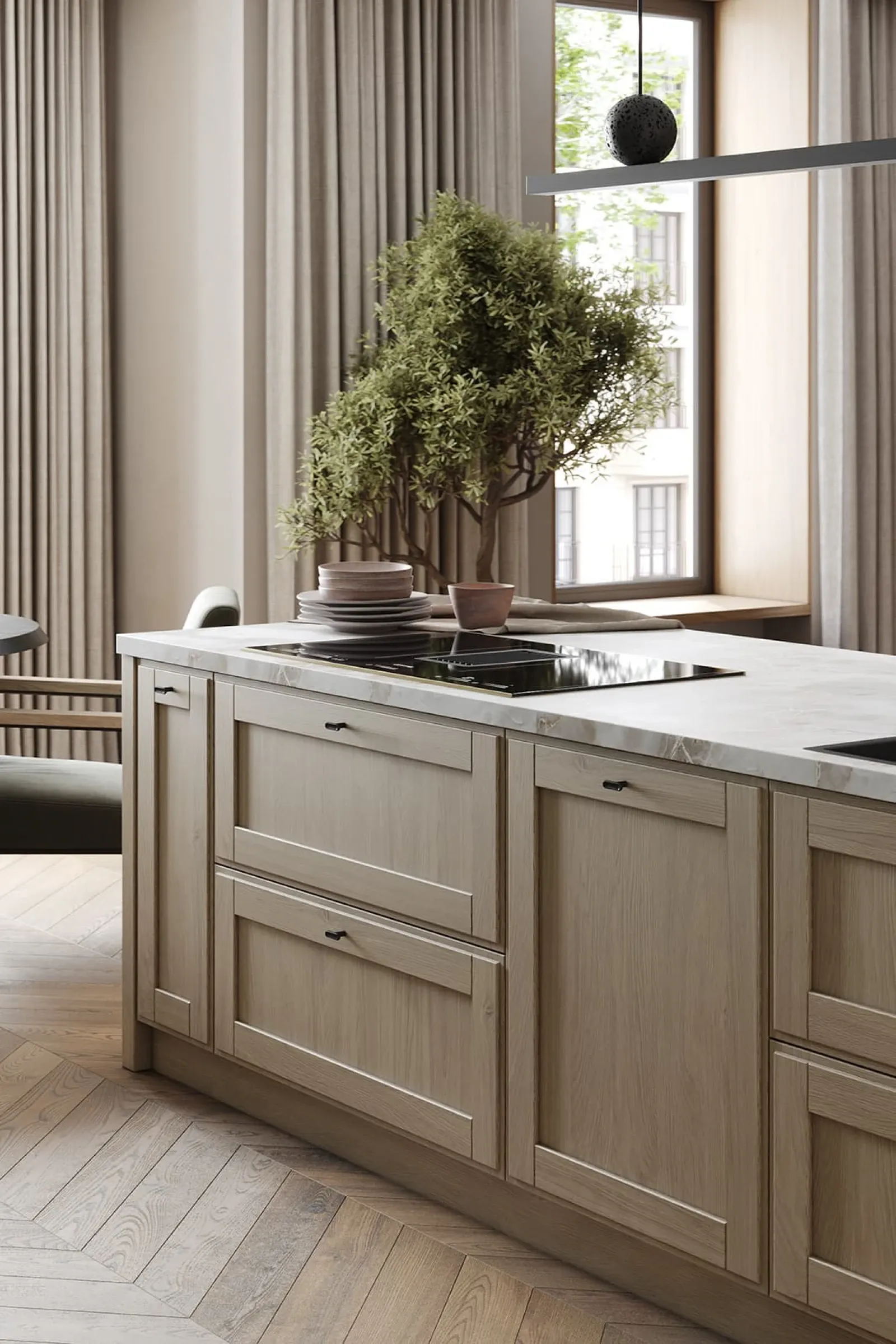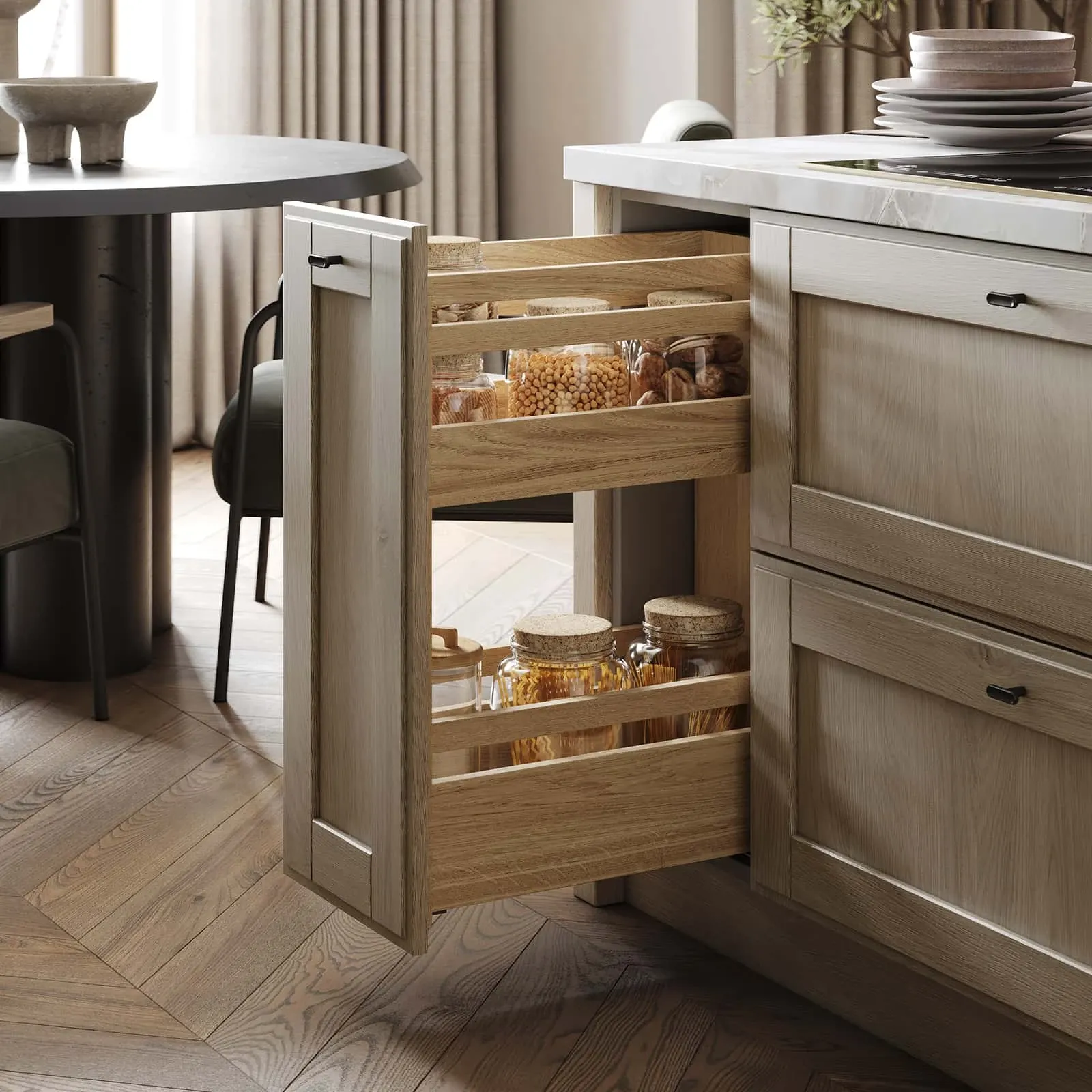 Аксессуары: Сушка для посуды в выдвижной ящик Mira, выдвижная система МОК (тип 1, массив дуба/шпон дуба), держатели для бокалов с крепежной планкой (массив дуба/шпон дуба)