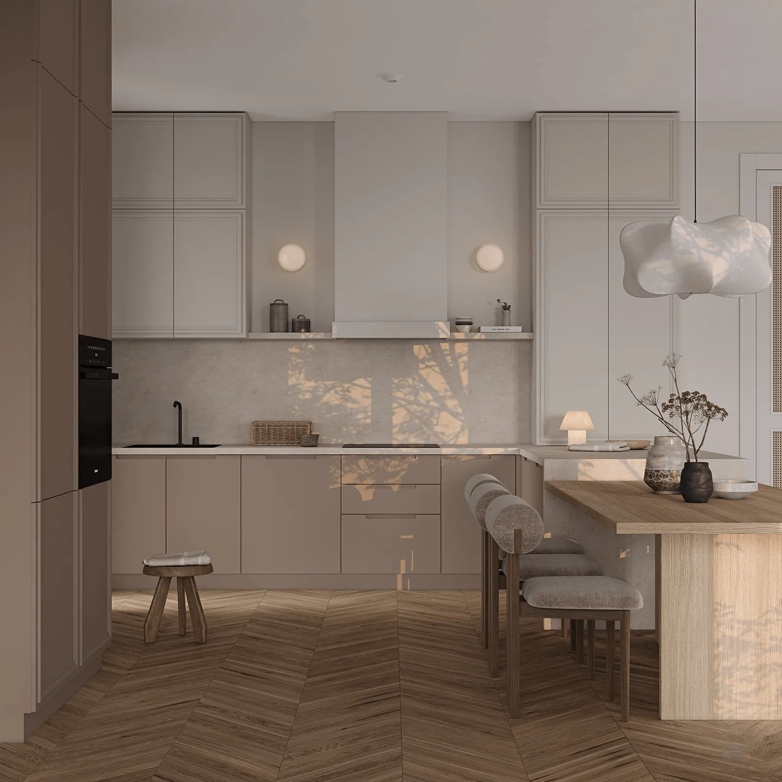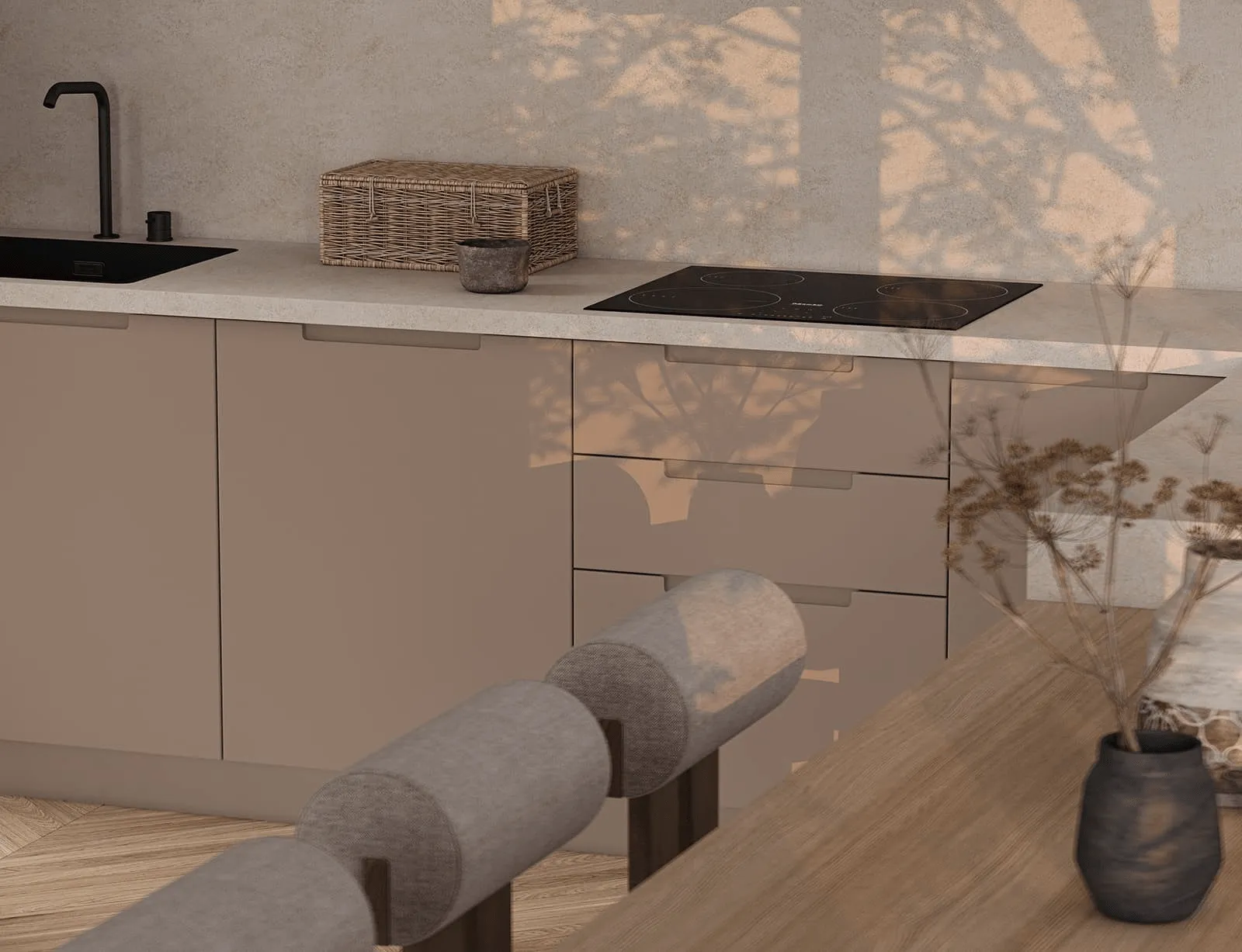 Фасады кухни, окрашенные в изысканные оттенки, придают ей особую привлекательность и создают атмосферу уюта и гармонии. Интегрированные ручки, практично встроенные в поверхности фасадов, придают кухонному интерьеру стильную и изысканную нотку. Это не только функциональное, но и эстетически привлекательное решение, которое делает кухню более элегантной и современной.