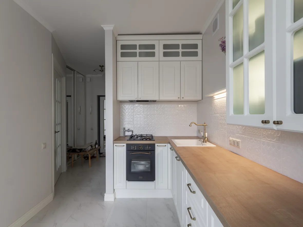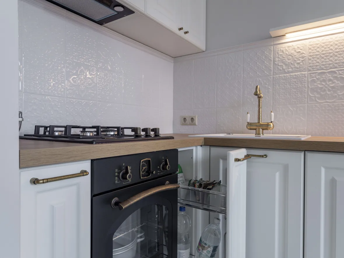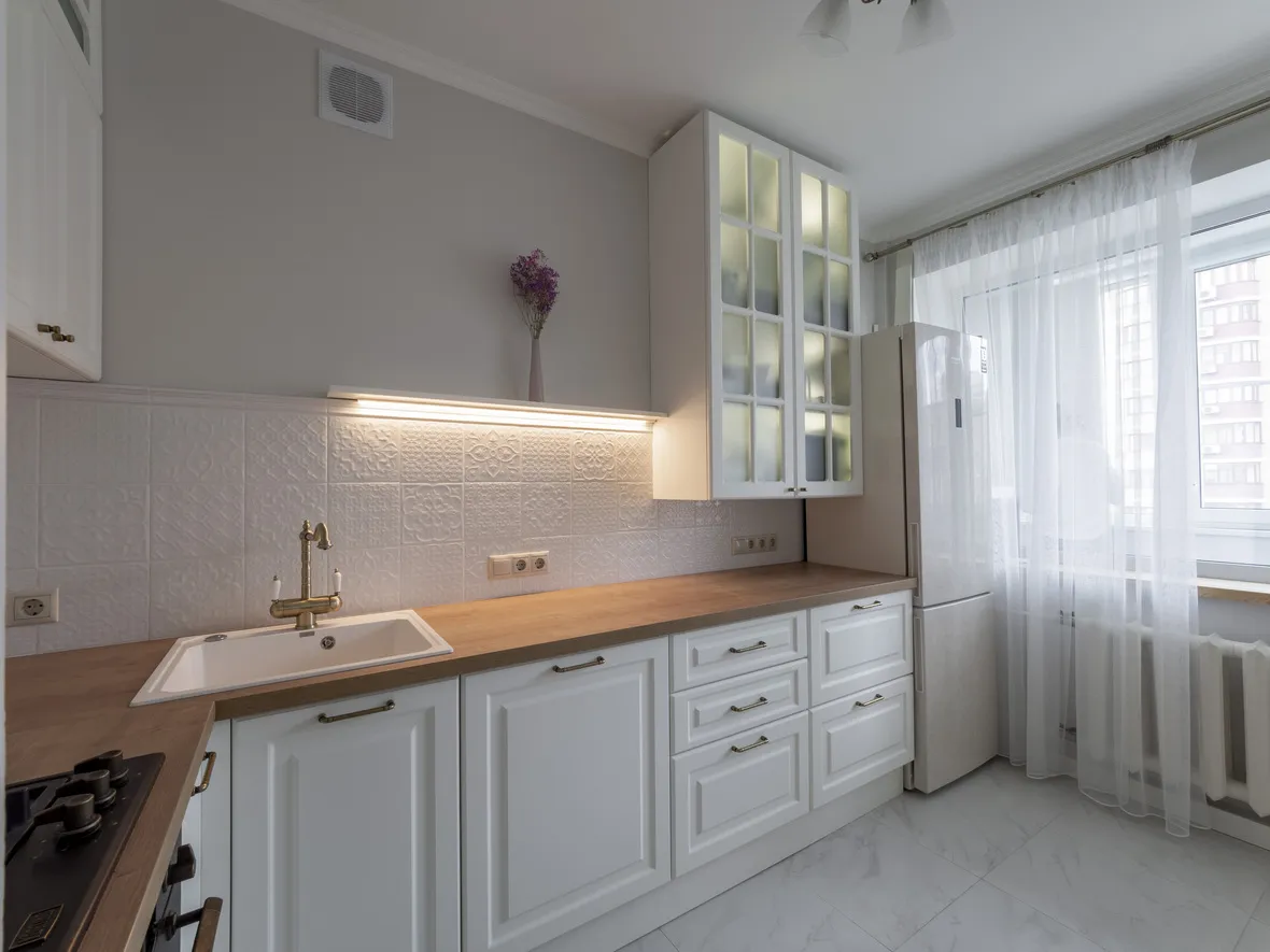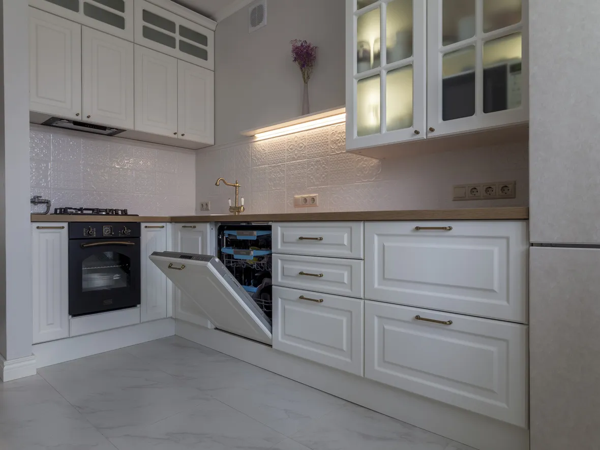 Техника: мойка - DR. GANS, смеситель - FLORENTINA, измельчитель - BONE CRUSHER, электрический духовой шкаф, полновстраиваемая вытяжка, газовая варочная панель, ПММ - KORTING