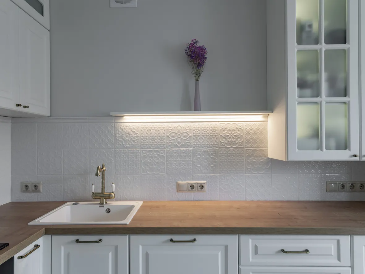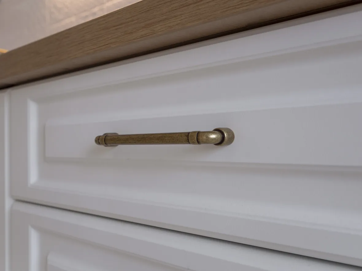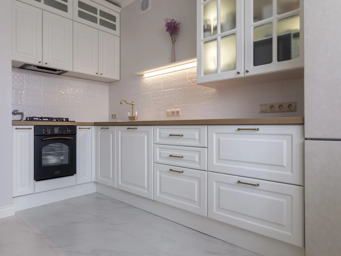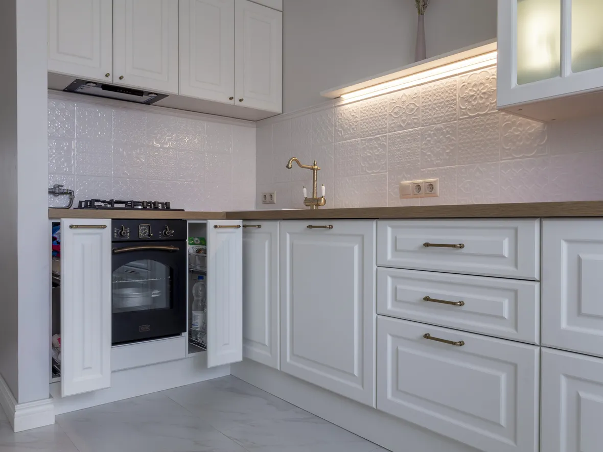Техника: мойка - DR. GANS, смеситель - FLORENTINA, измельчитель - BONE CRUSHER, электрический духовой шкаф, полновстраиваемая вытяжка, газовая варочная панель, ПММ - KORTING