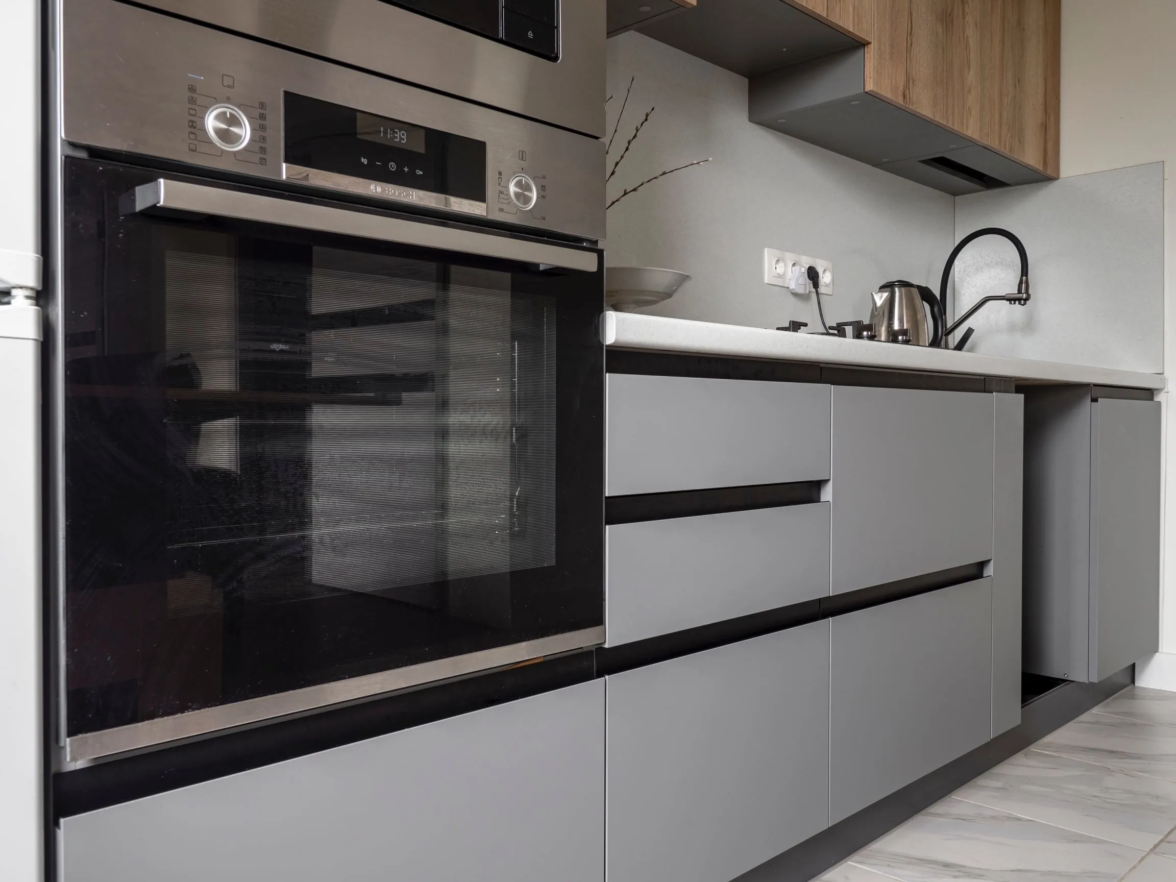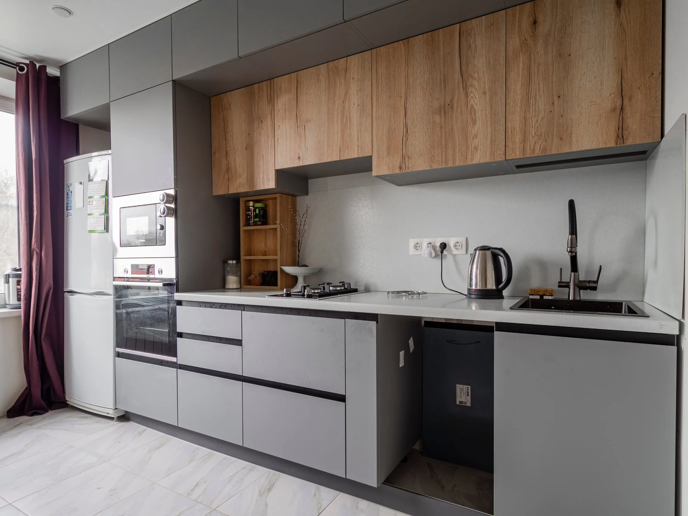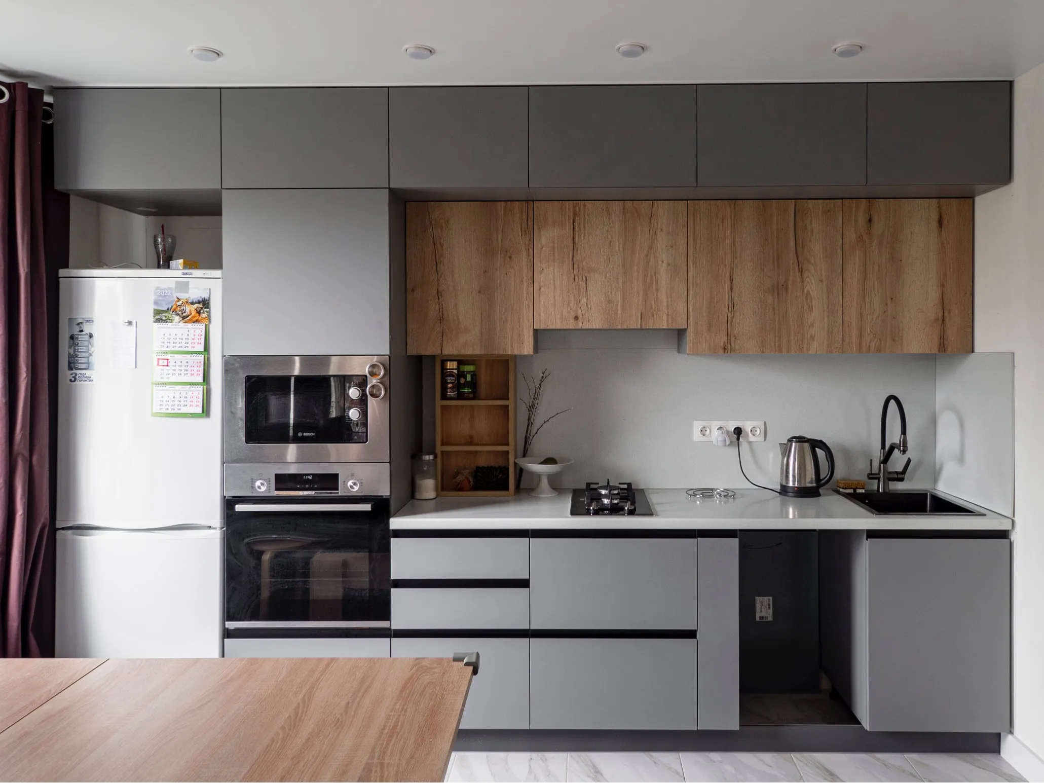 Фасады: ЛДСП Тимбер Галифакс верт / Акрил Серый мат