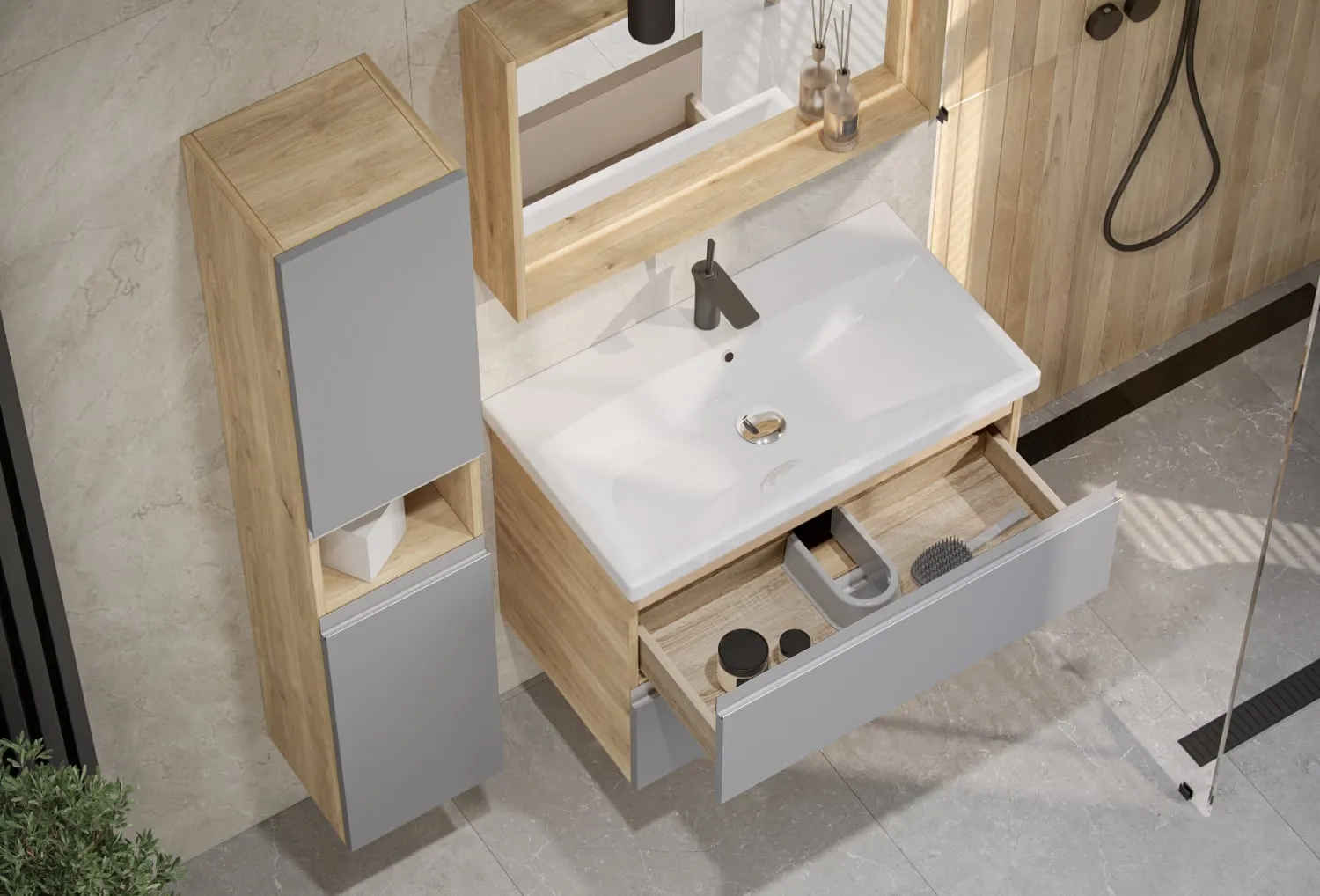 Корпус: ЛДСП Дуб Медовый Внутренний ящик Дуб Сонома, вырез под сифон Boyard серый